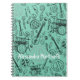 Prepare-se para a escola com este caderno aqua teal com desenhos de música como guitarras, bateria, sinais de paz, raios e uma vibe de roqueiro. Perfeito para crianças que amam música e personalizável para um toque pessoal!