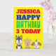 Desejos divertidos de aniversário para crianças com este design brilhante e colorido com Três cachorros bonitos vestindo chapéus de festa ao longo do fundo, e uma grande tipografia ousada em cores primárias, vermelho, azul e verde no topo. Feliz Aniversário está em uma fonte e cores definidas, e você pode facilmente personalizar a linha de cima com o nome da Criança e a linha de baixo com a idade. Se o seu nome for diferente do exemplo mostrado e você ainda quiser que ele alinhe o tamanho por meio de Personalizar Mais abaixo e, em seguida, selecione a caixa de texto do nome e puxe as alças do canto até que ele se alinhe melhor. Você também pode alterar o plano de fundo amarelo para outra cor se desejar, assim como as Cores do texto para nome, idade e dentro de saudação.