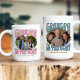 Uma caneca de cabra retrô para a vovó com foto personalizada. Sua foto será exibida em forma de adesivo de borda ondulada e enquadrada com "a vovó é a cabra". Personalize com o(s) nome(s) do(s) neto(s) ou netos ou qualquer texto que você quiser. Use a mesma foto na frente e atrás ou uma foto diferente para cada lado. Sinta-se livre para personalizar a paleta de cores na ferramenta design. Um presente legal e útil para uma avó que é a "Maior de todos os tempos" para feriado, aniversário, dia de as mães ou só porque!