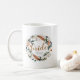 Esta caneca de cerâmica apresenta uma coroa boêmia de folhagem e penas em aquarela com uma fonte de letra divertida. Edite facilmente a palavra 'noiva' e edite os nomes e a data para combinar com o seu evento. Esta caneca é o presente perfeito para a noiva em seu dia especial ou como um presente para chá de noiva.