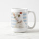 O gato de Devon Rex nomeou Casper na caneca azul pálido da listra.