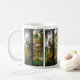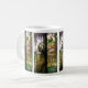 A reprodução bonita da janela de vitral de Tiffany de um jardim com um pavão e alguns pássaros do papagaio está nesta caneca.