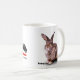 Uma caneca com o nome e o logotipo de BunnyLuv em um lado e no outro uma imagem de PETRA, que tem quase 11 anos velho e amores que escavam no feno e que snuggling com seus amigos do coelho.