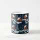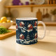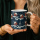Esta caneca de café impressionante apresenta um padrão repetitivo ousado e contínuo inspirado na arte popular tradicional escandinava. A ilustração retrata cabanas vermelhas aconchegantes e árvores estilizadas de folhas perenes contra um fundo escuro e nevado. O design de alto contraste cria uma atmosfera quente e nostálgica de inverno, perfeita para se aconchegar ao pé do fogo. Esta caneca única é um presente de Natal adorável para aqueles que apreciam o design nórdico, padrões gráficos ou decoração de casa distinta durante a temporada de inverno.