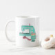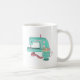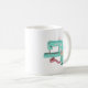 Máquina de costura em forma de vinheta, em tons de menta e cor-de-rosa, com uma almofada de pino de xícara de chá correspondente e fita de medição. Se você é um dos muitos entusiastas costurando lá fora você vai adorar ter sua bebida matinal nesta caneca divertida.