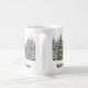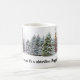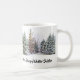 Esta caneca da temporada de inverno apresenta árvores da floresta cobertas de neve ao fundo e o texto " O inverno não é uma estação, é uma celebração. Feliz Solstício de Inverno. Use a caneca para sua celebração e durante toda a temporada de inverno.
