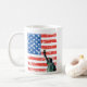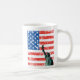 Uma caneca de café com uma bandeira dos EUA e a Estátua da Liberdade, celebrando a liberdade!