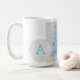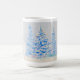 a neve cobria árvores aquáticas, com luzes coloridas no meio verde-médio. Um círculo com um monograma para personalizar para a sua doação de presente. e 'um feliz pequeno Natal para você' na parte inferior em texto colorido para combinar com as luzes na árvore. Arte original e design de caneca de Kristina Anderson