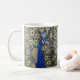 Uma linda caneca representando três imagens de pavões com as caudas no cheio