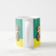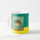 Uma caneca com um gato e um baiacu olhando um para o outro de surpresa