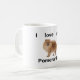 Uma caneca com as palavras "eu amo meu Pomeranian" com uma imagem de um Pomeranian no centro, sua parte de uma série de canecas que ajudam pessoas expressam seu amor para seu cão