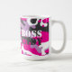 Mágicas e copos personalizados com "Senhora Chefe" em tipografia de stencil com camuflagem rosa em ambos os lados.