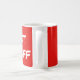 Caneca vermelha com as palavras "digno de nota" em um lado.