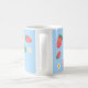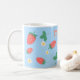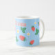 Uma caneca doce e fofa que apresenta um padrão encantador e divertido de minúsculos morangos espalhados sobre um fundo azul celeste suave. Os morangos são representados em um vermelho vibrante com folhas verdes e estão interspersos com pequenas e delicadas flores de morango brancas ou amarelas claras, aumentando o charme. A impressão geral é alegre, fresca e doce, tornando-a ideal para crianças.