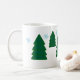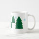 Pinheiros em dois tamanhos (3 grandes, 2 menores ao fundo). Árvores verdes têm flocos de neve azuis caindo no céu acima.