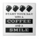 Este azulejo de cerâmica moderno é perfeito para um amante de café. Ele apresenta quatro canecas de café com palavras por baixo que leram "Comece seu Dia com Café e Sorria". Esta design é ideal para uma cozinha, um escritório ou apenas para decorar qualquer quarto.