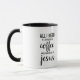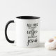 Esta caneca de café adorável lê "tudo que eu preciso sou um pouco do café e de uns muitos de Jesus".