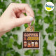 Esta é uma chaveiro divertida e colorida para o amante cristão do café. Apresenta diferentes tipos de café em xícaras, juntamente com biscoitos de chocolate e uma mensagem que diz "Café e Jesus".