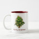 Caneca com design de árvore de Natal clássica, vermelha e verde. Mensagem de "Feliz Natal" por baixo.