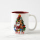 Beba sua bebida nesta caneca festiva de Natal. Você não encontrará ninguém mais legal que estes dois. Papais noeis e uma de suas renas se inclinando em uma árvore de Natal relaxando.