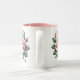 Este item é uma caneca de café com um sotaque cor-de-rosa dentro da caneca. Do lado de fora da caneca estão rosas rosa em ambos os lados.