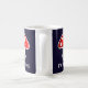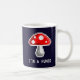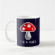 Uma caneca com um design de cogumelo vermelho em cada lado e um fundo escuro. O texto diz "Eu sou um fungo", mas pode ser mudado.