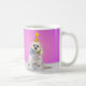 Festa Hat Pup Mug. "Esta é a minha caneca de aniversário" com um fundo de gradiente lavanda, bolo de celebração e confete, e um doce maltês Shih Tzu vestindo um chapéu de festa e gravata de arco. Um presente divertido para o amante do cão na sua vida.