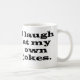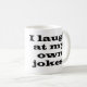 Você ouviu esse sobre a pessoa que riu de suas próprias piadas? Comprou esta caneca para anunciá-la ao mundo. A rotulação grande, corajosa, preta lê, "eu rio de minhas próprias piadas." Isso lembra-me… Um padre, um rabino e um ministro registrados em Zazzle e em cada um deles pediram esta caneca. Que? Você disse algo? Você está indo ter que falar acima. Eu não posso ouvi-lo sobre o som de meu próprio riso.