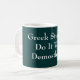 Uma caneca de turquesa escura com "Estudantes gregos fazem isso com demônios" em texto branco. Demóstenes era um orador na Grécia Clássica. Ele escreveu discursos para julgamentos. De um modo geral, qualquer estudante de direito grego terá lido parte do seu trabalho, e alguns que estão a aprender a língua grega também o farão, talvez até traduzindo parte dele! Esta caneca é boa para quem estuda Grécias grega ou antiga.