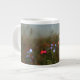 Numa manhã sombria, um jovem veado fica num prado florescente, quase escondido pela grama e pelas flores.