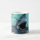 Excelente tubarão branco a arder a partir da água num pano de fundo azul perfeito para o pescador ou filhote