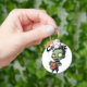 Um chaveiro circular com um zumbi cartoon segurando uma xícara de café que lê "Cafeine me Mantém vivo", com "Cafeine" em uma fonte que goteja acima de sua cabeça.