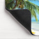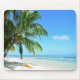 Mousepad de um caiaque amarelo sob uma palmeira de suspensão em uma praia branca da areia na ilha tropical de Moorea, perto de Tahiti, no arquipélago pacífico Polinésia francesa.