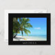 Cartão-postal de um caiaque amarelo sob uma palmeira pendurada numa praia de areia branca na ilha tropical de Moorea, perto do Tahiti, no arquipélago pacífico Polinésia Francesa com uma fronteira negra e o texto: "Moorea".