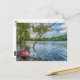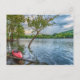 Um cartão postal com um caiaque vermelho flutua perto da margem perto de uma pequena árvore torta em uma manhã nublada de verão em Oak Grove Arkansas, Estados Unidos no Table Rock Lake. Procurando mais impressões ou produtos? Sinta-se à vontade para visitar minha loja: http://www.zazzle.com/timelessmomentsphtgy