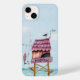 Uma cabana de pesca de praia cor-de-rosa torta erguida em alambiques tem o dia pendurado na linha do lado de fora. Uma gaivota guarda no telhado rosado e o cartaz de Meow junto à porta da frente dá uma pista de quem mora lá. Um céu com aquarela e mar dão vibrações náuticas agudas na praia.