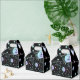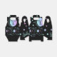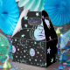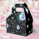 Caixa de presente ou caixa de favor com design celestial com sóis, luas e estrelas em cores pastel em fundo preto.