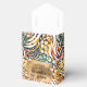 Uma caixa de favores colorida do padrão de impressão leopardo silvestre fecha com uma fita e mostra a sua obrigado que você envia na frente com uma letra chic na folha falsa de ouro na frente. Bonita para a festa de aniversário feminina, caixas de chá de panela, garotas, noite fora e muito mais. CORRESPONDENDO a itens na nossa loja.