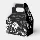 Uma bela caixa de favores em forma de gel tem uma janela sem recorte, mas ela tem um bom padrão floral em preto e branco e os nomes do recém-casado no topo. Mostrado em fundo preto. Personalize ou compre conforme projetado. Coordenadas com o "Convite de casamento do templo Floral Negro e Branco" e com o "Convite de Recepção do Templo Floral Negro e Branco" e os "guardanapos de papel Floral Negro e Branco".
