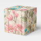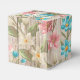 Casamento bonito ou ocasião especial favorece a caixa de presentes, com gráficos de flores azuis e cor-de-rosa em um fundo parecido com madeira. Uma área de texto visível através do branco, na tampa da caixa, tem texto personalizado pronto para personalizar o seu evento.