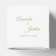 Essa simples caixa de favores de caligrafia em ouro traz um luxo elegante, mas moderno, a um casamento minimalista e mais tradicional ou formal. A caligrafia casual permite um sentimento antigo, enquanto o design neutro de classe pode ser combinado com quaisquer aspectos únicos da celebração do casamento.