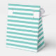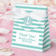 Caixa de favoritos de casamento do aqua náutico / azul-turquesa e listras brancas com texto personalizado agradecendo convidados. Obrigado personalizado que você envia da noiva e do noivo, além da data do casamento. Impressão de linhas bonitas com arco branco elegante. Cor de fundo personalizável. Também disponível em azul marinho. Design de tema marítimo costeiro costeiro com vintage velando navio/ícone de lancha. Âncoras são símbolo de peso. Também é bom para o casamento clássico do oceano / praia, chá de panela chic, noivado, aniversário, aniversário, chá de fraldas etc.