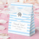 Caixa de favorecimento do chá de fraldas de elefante de cinza bonita. Pastel design de listras azuis e brancas com ícone zoológico animal. Obrigado personalizado para a mensagem que vem. Impressão de linhas bonitas com tipografia de script elegante e bezerro adorável. Cores de fundo personalizáveis para design neutro de gênero para comemoração de festa de babyshower. Material de festa divertida para uma nova menina/criança recém-nascida. Tema da selva/safari. Caixa de favoritos de forma de tenda.