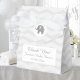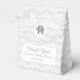 Caixa de favorecimento do chá de fraldas de elefantes, cor-de-rosa-branca e cinza. Design de padrão de stripe do diafragma do Pastel com ícone do zoológico. Obrigado personalizado para a mensagem que vem. Impressão de zag em Cute com tipografia elegante e bezerro adorável. Cores de fundo personalizáveis para design neutro de gênero para comemoração de festa de babyshower. Fornecimentos de festas divertidas para o novo bebê/recém-nascido. Tema da selva/safari com fundo listrado. Caixas de torção com linhas zigzag.