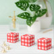 Uma caixa de favoritos de parte com um padrão retro vermelho e branco marcado de xadrez. Clique em Personalizar para adicionar seu nome ou mensagem, alterar o tamanho e até salvar seu design para mais tarde.