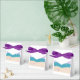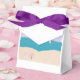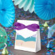 Este favor ou caixa de presentes foi desenhado com a minha representação de uma cena de praia com uma cadeira e guarda-chuva ao lado de um oceano turquesa.