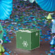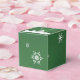 Passe presentes de Natal com esta caixa de favores verde de Natal brilhante. Design de caixa de favoritos apresenta um trio de neve coberta de árvores de Natal decoradas contra fundo verde e flocos de neve caindo. Itens adicionais de presentes e feriados disponíveis com este design também.