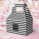 Esta caixa de favor distribuída é preto e branco. Personalize a caixa de favoritos com o texto desejado, como o nome da noiva e do noivo ou a data do casamento.