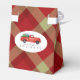 Esta caixa de favoritos apresenta um padrão clássico de xadrez vermelha. No centro há um oval branco, com um caminhão de coleta vermelho. O caminhão de coleta tem uma árvore e presentes.