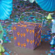 Fornecimentos perfeitos para o Halloween - este recipiente listrado laranja e roxo é excelente para as festas de Halloween.